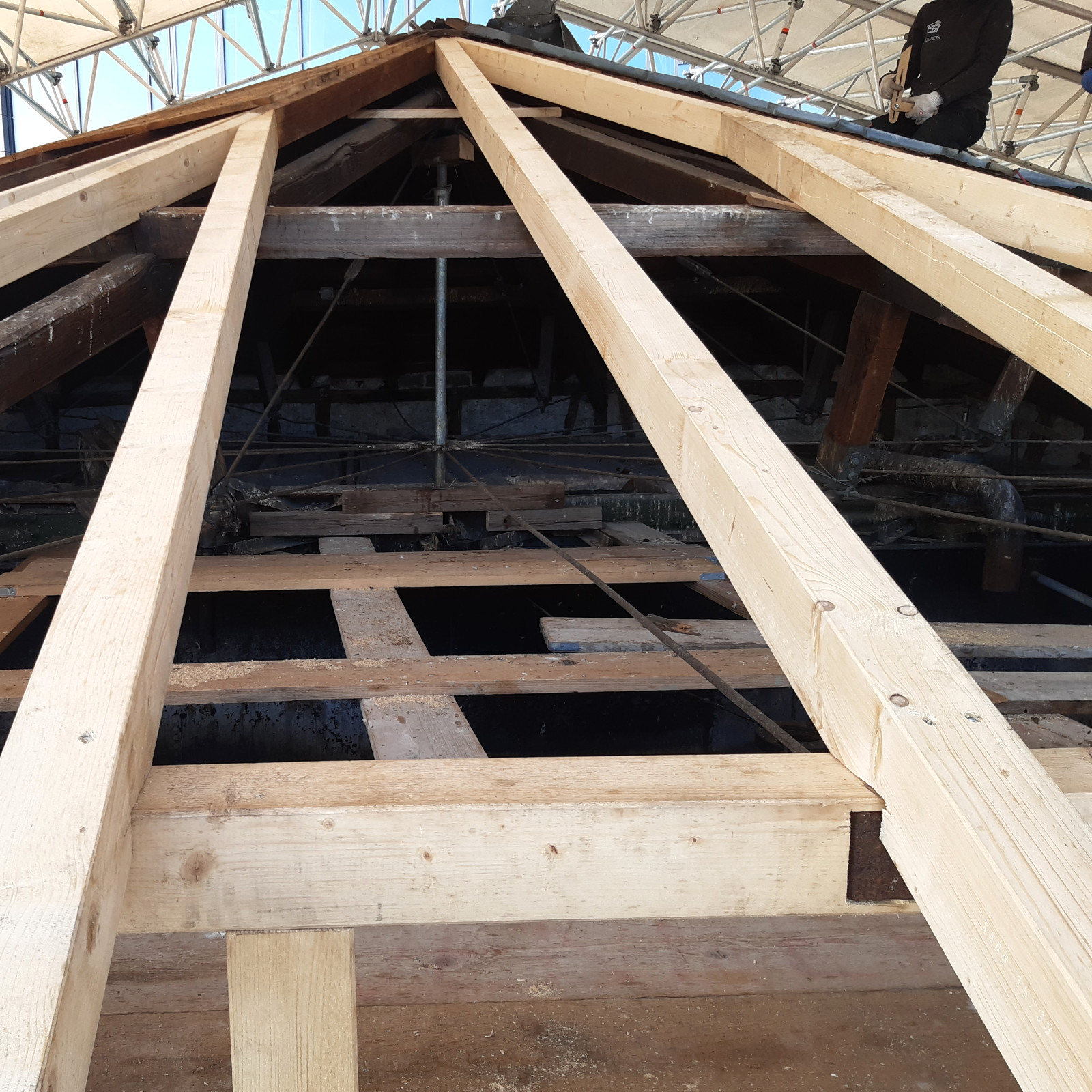 Sanierung hölzerne Turmkonstruktion und Dach, Erneuerung der Außenverschalung