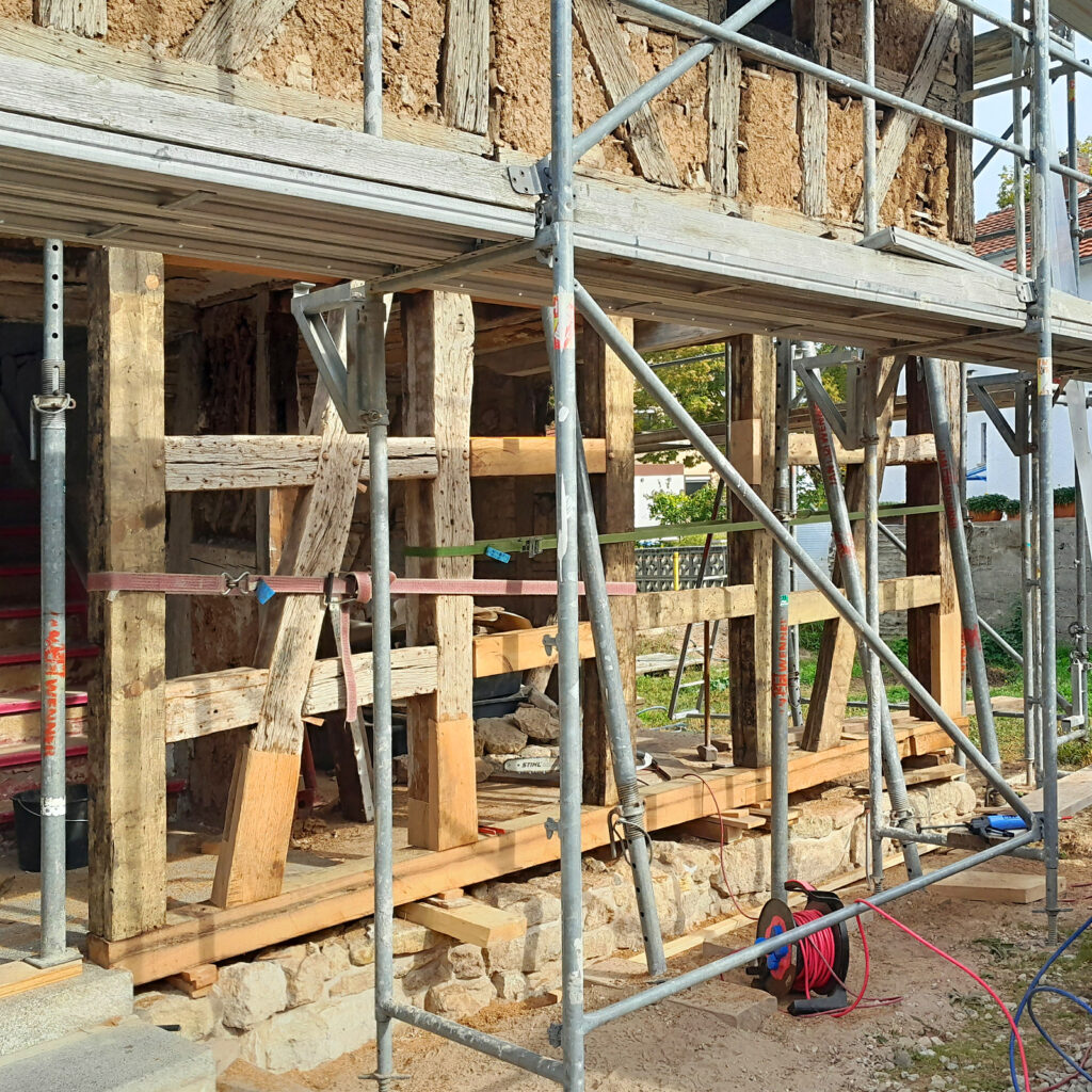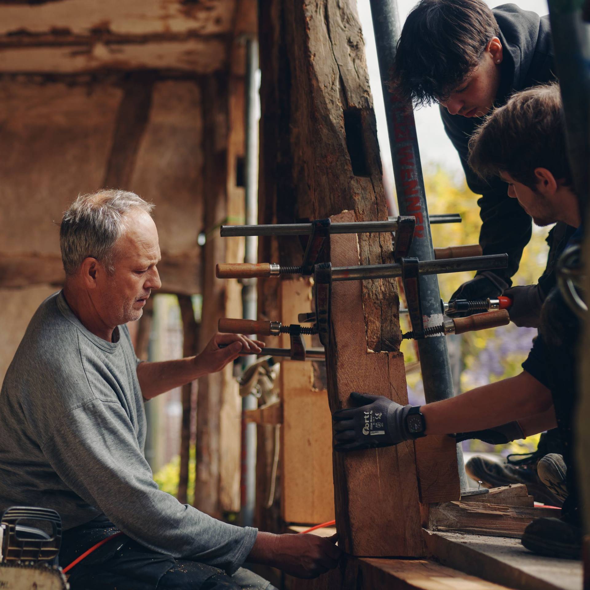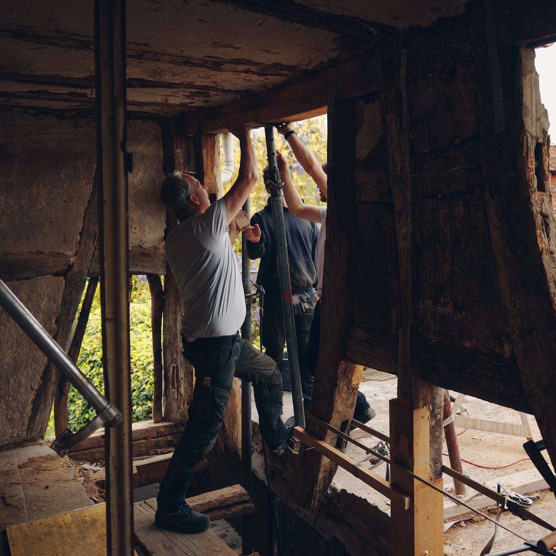 Und auch wenn Fachwerkbauten eine enorme Lebensdauer haben können, so gibt es doch immer wieder Umbau- und Restaurierungsbedarf – auf handwerklich hohem Niveau und historisch angemessen. Dann müssen Konstruktionsteile ausgetauscht oder ertüchtigt, Profile und Oberflächen angepasst, oder Holzverbindungen wieder tragfähig gemacht werden.