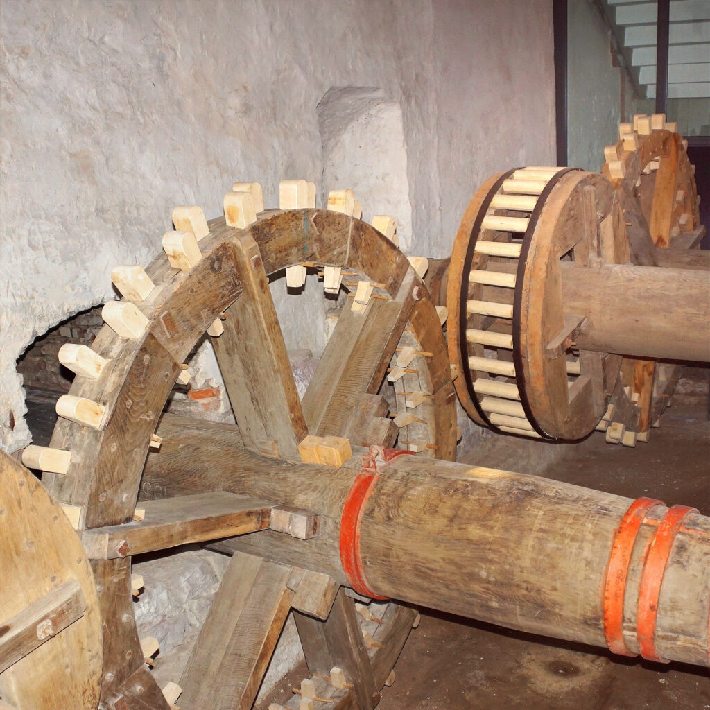 Sanierung der hölzernen, wassergetriebenen Kurbelmaschinerie aus Stock- und Kammrädern, Antriebswellen und Knochenstampfe